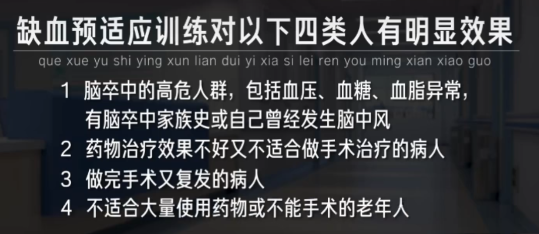 他表示,缺血預(yù)適應(yīng)的訓(xùn)練,主要是用于心腦卒中的預(yù)防和治療,經(jīng)臨床結(jié)果表明,對(duì)這四類(lèi)人群有顯著的效果。
