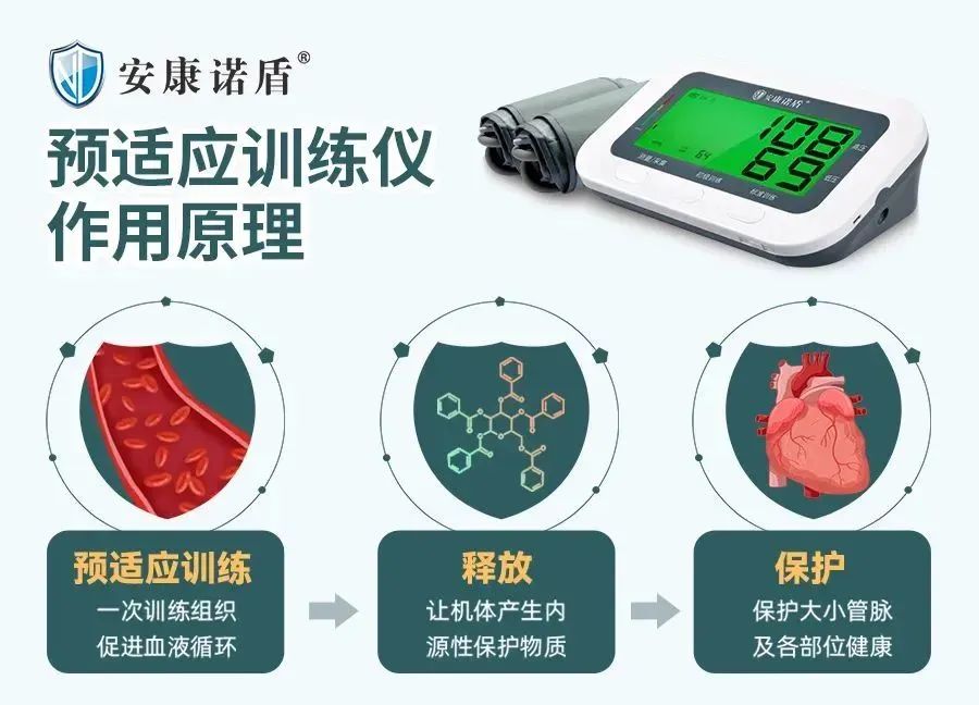 安康諾盾預適應訓練儀就是這樣一款儀器,通過對人體進行反復、短暫、無創傷、無危害的缺血預適應訓練,激發人體免疫系統的應急機制,從而達到預防心腦血管等疾病的發生。
